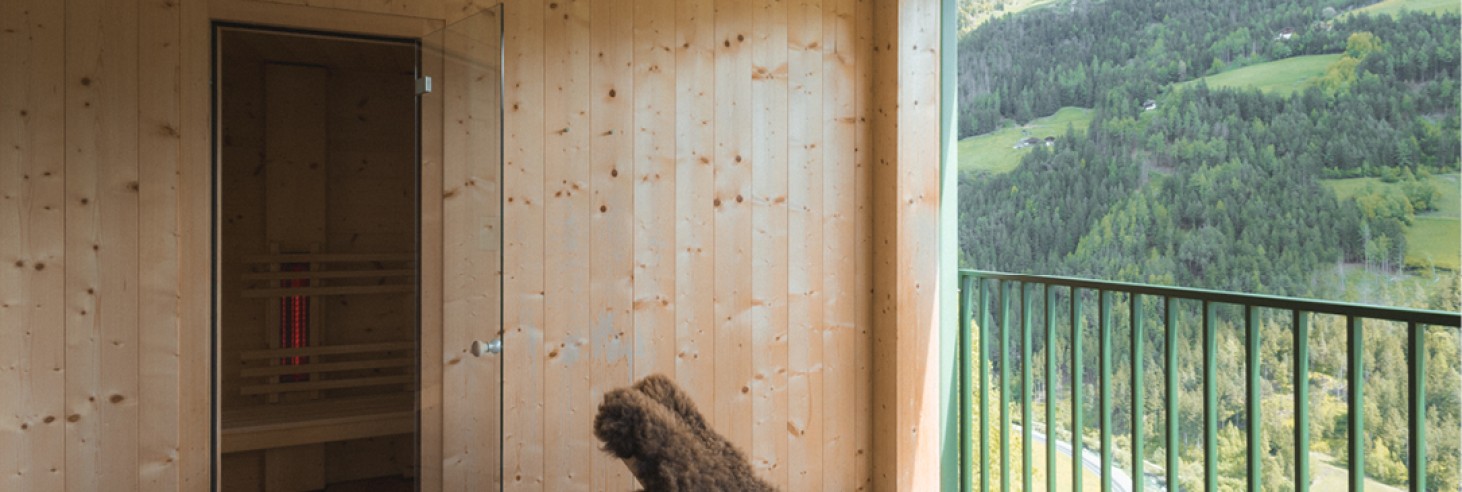 große Terrasse mit Sitzgelegenheit und Infrarotkabine