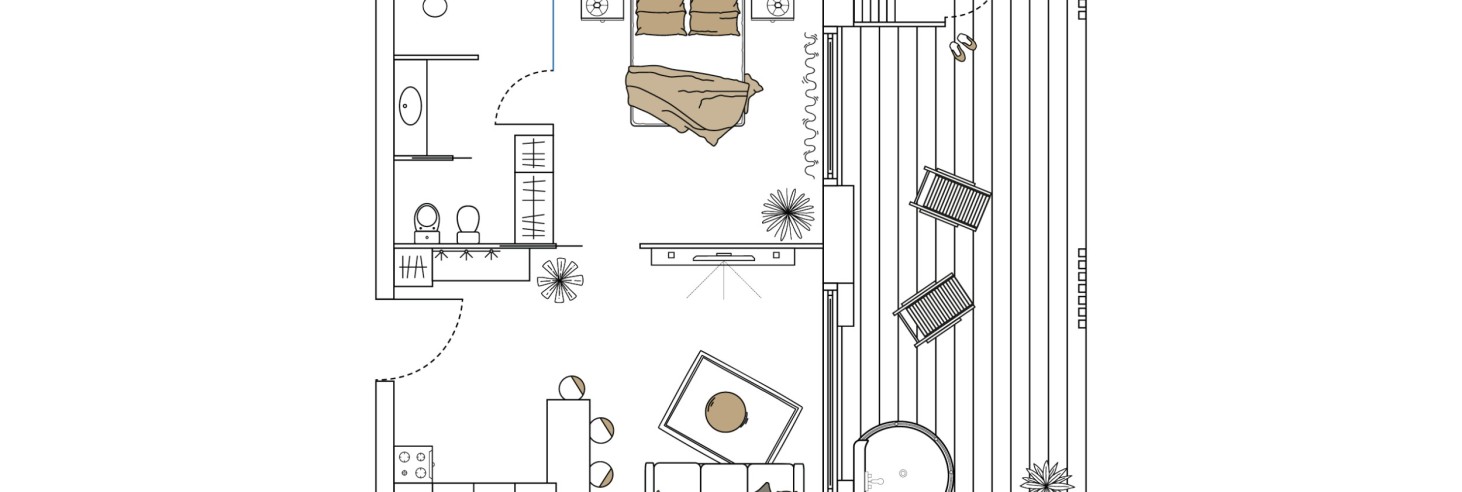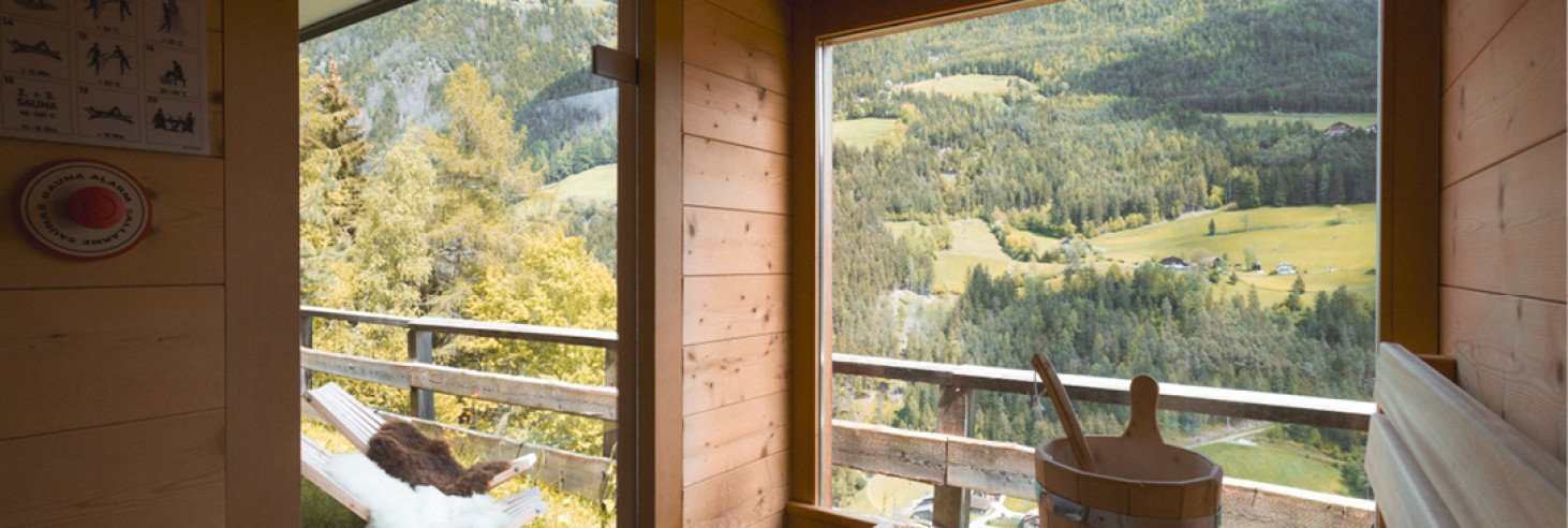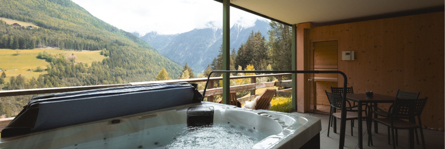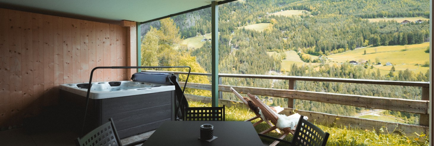große Terrasse mit Sitzgelegenheit, finnischer Sauna und Jacuzzi-Whirlpool