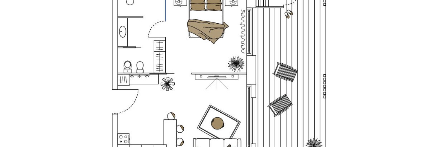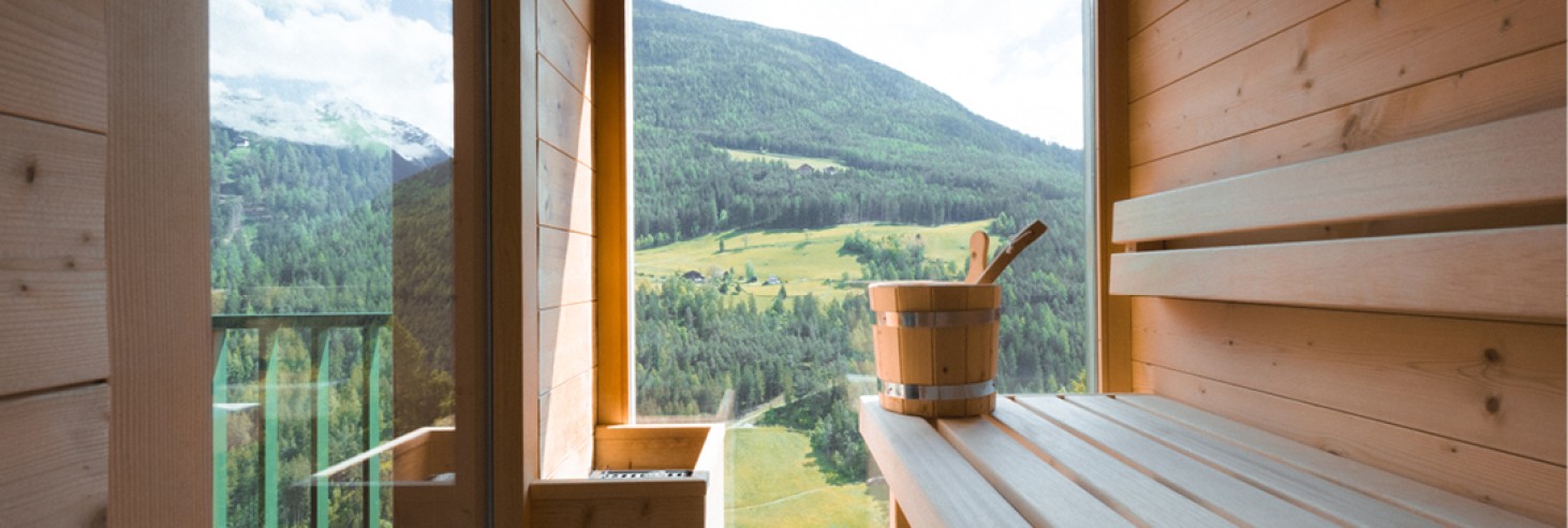große Terrasse mit Sitzgelegenheit und finnischer Sauna